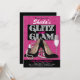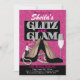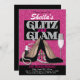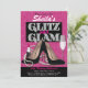 Este design de aniversário brilhante e glamouroso apresenta um par de calçados pretos de salto alto, um fundo brilhante rosa quente, um copo de champanhe, uma corda de pérolas e um batom. Todas as coisas cintilantes, brilhantes e glamourosas!