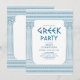 Convite de festa de aniversário com Toga grega ou romana elegante com pilares de templo elegantes e padrão de meandro grego em azul. Produto personalizável para uma celebração memorável. Perfeito para casamentos, noivados, festas de formatura, aniversários, save the dates, despedida de solteira e festas de aniversário.