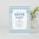 Convite de festa de aniversário com Toga grega ou romana elegante com pilares de templo elegantes e padrão de meandro grego em azul. Produto personalizável para uma celebração memorável. Perfeito para casamentos, noivados, festas de formatura, aniversários, save the dates, despedida de solteira e festas de aniversário.