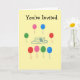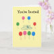 Este cartão é um convite para uma criança para a festa de aniversário de outra criança. A frente do cartão contém o convite e é decorada com balões e um desenho de um bolo. Dentro, o possível organizador da festa pode especificar a data, o local e a hora da festa. O interior também observa que a festa terá balões, bolo, biscoitos e sorvete.