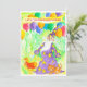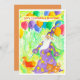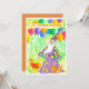 Um convite de aniversário personalizado colorido com um mago caprichoso e seu cachorro conjurando um presente divertido com balões coloridos ilustrados com aquarela.
