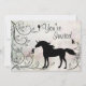 Convite de festa de aniversário personalizado com silhueta de unicórnio e fadas em uma floresta mágica e de fantasia.