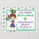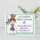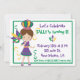 Este convite de festas de aniversário fofo apresenta uma garota em uma roupa de Mardi Gras e Fleur De Lis em cores roxa, verde e dourada. Fácil de personalizar com as informações da sua parte.
