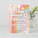 Celebre com estilo retrô com este convite de aniversário arco-íris retrô apresentando listras pastéis, margaridas alegres, sinais de paz, borboletas e fontes negritas divertidas. Perfeito para adolescentes que amam designs vibrantes e inspirados em hippies, este convite personalizável define o tom para uma festa divertida e colorida. Ideal para aniversários de 13 anos ou qualquer celebração marcante, ele mistura charme nostálgico com um toque moderno para tornar seu evento inesquecível.