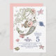 Uma aquarela e um convite de aniversário de 5 com tema ilustrado da sereia. Sereia e caranguejo com criaturas do mar em volta dela. Um belo convite para estilo artístico e caprichoso. Rosa no fundo do convite.
