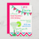 O convite de aniversário do adulto do divertimento feito em um tema mexicano colorido. Os gráficos coloridos de um rosa, de uma turquesa, e de uma bandeira verde da flâmula, um teste padrão de harmonização da viga, e de uma bebida de vista saboroso do margarita, decoram o convite festivo. o texto Multi-colorido está inteiramente customizável e pronto para personalizar para seu evento.