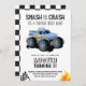 Um convite de caminhão monstro, com um caminhão monstro azul com chamas. Edite o texto para que ele possa ser usado para sua parte.
