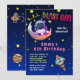 O Convite de aniversário Moon Adventure (garota) apresenta texto dizendo, 3,2,1— Explosão! Tem um astronauta personalizável posando com uma lua crescente. Em seguida, há um lugar para colocar o nome da criança. Uma nave de foguete se acelera no fundo. Tudo contra um céu estrelado. O verso do convite tem muitas ilustrações espaciais legal.