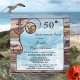 Um convite de festa de aniversário com tema náutico com ondas do oceano emolduradas por madeira rústica desgastada, uma âncora e um nó amarrado em forma de coração.