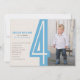 Este quarto convite de aniversário apresenta um gigante número quatro em azul. O fundo foi projetado para parecer papel kraft. Os detalhes da sua festa de aniversário estão definidos para a esquerda e a foto é exibida à direita.Fotografia © Storytree Studios, Stanford, CA