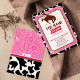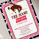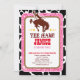 Olá! Celebre sua Festa de aniversário com nosso Convite de festas de Cowgirl. Esta convite de festas ocidental apresenta uma vaqueira rodeada no seu cavalo, um padrão de cotovelo e um padrão de paisley cor-de-rosa. Um convites de festas de rodeio perfeito para a festa de aniversário oeste selvagem da sua menina, convites para chuveiros de bebês ocidentais ou usá-los como convites para rodeios de vaquinha