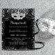 Para uma elegante máscara, 50º (ou qualquer idade) aniversário. Um fundo preto. Decorado com purpurina prateada falsa e uma máscara de mascarada. Personalize e adicione um nome, idade e detalhes da festa. O nome é escrito com uma fonte de letra manuscrita