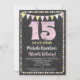 Um convite de aniversário de 15 cor-de-rosa e amarelo, com texto de giz entupido no topo, com fundo de chalkboard, bandeiras e uma bela borda poka-dot.