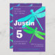 Convite para a celebração de 5 de um menino com libélulas azuis e verdes brilhantes sobre fundo roxo