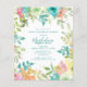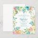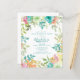 Novo para o Verão de 2024. A cor da água floral de Verão moderna e colorida apresenta flores cor-de-rosa, azuis-turquesa, amarelas e laranja. Eles formam uma estrutura botânica, rústica e bófia em torno de seus detalhes de festa de aniversário. Este item faz parte da coleção de Flores de Aquarela de Verão. Contém modelos de convite, sinais de boas-vindas e decorações de festas.