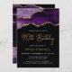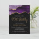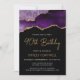 Este elegante convite de aniversário apresenta uma imagem de aquarela de um geode agado em tons de roxo com realces de brilho dourado falsos. As palavras "90 Birthday" aparecem em um guião de escrita de mão dourado moderno. Personalize-o com o nome da honraria em texto dourado e os detalhes em branco sobre fundo preto. Um design de agate roxo e dourado correspondente aparece no lado oposto.