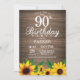 Convite de Aniversário para 90 de Girassol Russo. Flores Florais e Fundo de Madeira Rústica. Retro de Vintagem do País. Mulheres Aniversário. 15 de 12 de 16º 20 de 18º de 13 21rua 30 de 40º de 50º de 60º de 70 90 de 100º de qualquer idade. Digital Imprimível. Para mais personalização, clique no botão "Personalizar" e use nossa ferramenta de design para modificar este modelo.