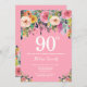 Convite de Aniversário para 90 Floral Rosa para Mulheres. Flor Floral de Aquarela. Fundo Rosa. Rosa, Amarelo, Laranja, Flor Roxo. Aniversário Adulto. 13 15 16º 18º 20 21rua 30 40º 50º 60º 80 de 70 100º, qualquer idade. Para mais personalização, clique no botão "Personalizar" e use nossa ferramenta de design para modificar este modelo.