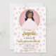 O convite para o aniversário desta menina apresenta uma princesa africana americana fofa com vestido rosa, coroa e luvas em um passado rosa super bonito.