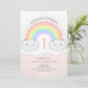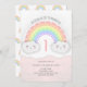Um convite de aniversário em rosa e branco para o Pastel Rainbow & Clouds Aniversário em rosa e branco Envie estes bonitos convites arco-íris a amigos e familiares para os convidarem para a festa de aniversário gentil do seu filho. Este design é perfeito para primeiro aniversario de meninas. Esses convites sonhosos do arco-íris apresentam nuvens kawaii bonitinhas e detalhes falsos de brilho prateado com um fundo cor-de-rosa balé. Personalize seu convite com seus detalhes de evento em uma bela tipografia de script. Itens correspondentes: https://www.zazzle.com/collections/pastel_rainbow_party_decor-119644976694566465