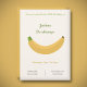 Um simples convite de aniversário com uma ilustração de banana amarela e textos em verde, amarelo e cinza! Você pode personalizar textos e usá-los para uma festa de inauguração de casa, um casamento, aposentadoria, uma festa de solteira, etc.