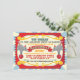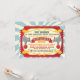 Convites de festas de aniversários charmosos de Circo ou Carnaval com elefantes e macacos tocando uma faixa para recebê-lo na festa. Formatado como uma passagem vintage para uma performance com um fundo de explosão solar. Ilustração desenhada à mão por McBooboo.