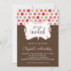 Um convite de aniversário de padrões de bolinhas cor-de-rosa, vermelha, verde e laranja perfeito para festas de aniversário com tema retrorado. O fundo está texturizado.