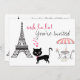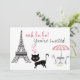 Convite de aniversário de Paris de Gato Fofo Personalizado. Este convite apresenta um gato adorável em Paris com a torre Eiffel e uma mesa de café.