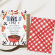 Blue Mitt Boys Churrasco de Aniversário convite de aniversário de CHURRASCO de Convite de Aniversário com Churrasco vermelho, garrafa de molho, luvas de forno azul, carvão, kebabs, salsichas e muito mais no design de convite de aniversário de churrasco de quintal colorido.