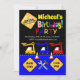 Um convite de aniversário de construção com caminhões e placas de construção. Cores brilhantes em um fundo preto fazem esse garoto convite de aniversário pop!