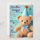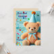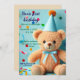 Este convite apresenta um design alegre e lúdico, ideal para a festa de aniversário de uma criança ou para uma celebração festiva. Mostra um ursinho giro com pelo castanho claro, vestindo um chapéu de festa azul com pom no topo e um arco azul correspondente ao redor do pescoço, também um fundo azul claro adornado com pontos de confete coloridos e galhos de fita, acrescentando uma vibração vibrante e celebratória. Os tons brilhantes e pastéis, incluindo o azul, o rosa, o amarelo, o laranja e o verde, criam um humor animado e convidativo.