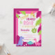 Convite de aniversário para mulheres, com dinossauros cor-de-rosa, púrpura e azul, folhas verdes e roxas.