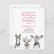Seu pequeno está virando um! Convide seus convidados especiais com este adorável cartão postal de convite que inclui animais de fazenda feitos à mão (cavalo, porco, vaca e pintinho) em preto e branco. O nome do bebê, "primeiro aniversário" e a data estão em tipografia de script com letras vermelhas, e personalizada em um sans negro moderno chic. Copyright Elegant Invites, todos os direitos reservados.