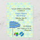 Convite de festas de piscina de aniversário divertida feito em verde-menta colorido, com fundo de bolinhas azul, branco e amarelo. Gráficos de um guarda-chuva solar, uma bola de praia, e um par de chinelos decoram o lado inferior esquerdo do convite. O texto em preto e azul está pronto para personalizar a sua festa especial de piscina. Excelente para festas de meninos ou meninas.