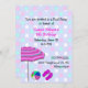 Convite de festas de piscina de aniversário divertida feito em uma lavanda colorida, com fundo aqua, branco e bolinhas rosa. Gráficos de um guarda-chuva solar, uma bola de praia, e um par de chinelos cor-de-rosa decoram o lado inferior esquerdo do convite. O texto em preto e rosa está pronto para personalizar o dia especial da sua filha.