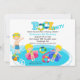 Comece a comemorar com este convite adorável. Perfeito para a piscina daquele aniversariante. Tem um fundo branco. Há uma grande piscina de natação com um adorável, bonitinho ao seu lado numa poça de água. Ele tem cabelos loiros e óculos azuis na cabeça. Na piscina está um rapaz loiro giro flutuando numa balsa. Ao lado dele está uma adorável garota loira flutuando numa balsa rosa quente. No topo do convite está a palavra piscina. Os dois O's na piscina são tubos coloridos. Veja os muitos outros produtos e designs nesta linha da piscina. ©JW Ilustrations