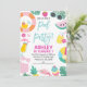 Convite de Aniversário para Festas de Piscina de Verão à procura de um convite de aniversário para a piscina de Verão? Esta design colorida apresenta vários itens de verão, assim como algumas folhagens tropicais.