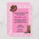 Convites de aniversário cor-de-rosa para cowboys com um chapéu de cowboy de banda rosa e uma bota. O fundo é uma bandana cor-de-rosa. Tema ocidental só para garotas.