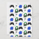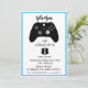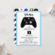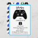Chamada de Aniversário para Jovens. Cores verde limão, azul e cinza. Controladora, fone de ouvido, gráficos nivelados.