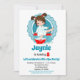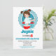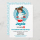 O convite de aniversário desta rapariga apresenta uma adorável rapariga Brunette a mergulhar os pés em água pedicura com bolhas por toda a parte. Turquesa, vermelha e branca.