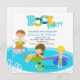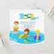 Comece a comemorar com este convite adorável. Perfeito para a piscina daquele aniversariante. Tem um fundo branco. Há uma grande piscina de natação com um adorável, bonitinho ao seu lado numa poça de água. Ele tem cabelo castanho e um maiô de laranja. Há um tubo verde ao redor da cintura. Na piscina está um rapaz loiro giro flutuando numa balsa. Ao lado dele está uma adorável garota de cabelos castanhos flutuando em uma jangada verde. No topo do convite está a palavra piscina. Os dois O's na piscina são tubos coloridos. Veja os muitos outros produtos e designs nesta linha da piscina. ©JW Ilustrations