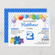 Convite de aniversário de um menino azul giro, mostrando um trio de sapos vibrantes de olhos largos e um conjunto de balões coloridos. Na frente, você pode personalizar o nome e a idade da criança, além da data, dos detalhes do rsvp e do local. O pano de fundo inclui um padrão moderno em azul, que está ligado à idade principal, e este padrão é repetido ao contrário. Tudo que você precisa fazer é mudar o número uma vez, e ele automaticamente mudará o padrão. (Estes são convites orçamentários de boa qualidade, portanto lembre-se de adicionar envelopes e/ou transferir design para estoque de cartão, se preferir.) Este convite seria excelente para qualquer criança que amasse sapos coloridos, de olhos largos e balões. Outras variações sobre esse tema estão disponíveis.