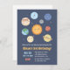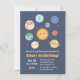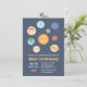 Um convite de aniversário colorido e bonito do espaço com ilustrações bonitas do sol e planetas do sistema solar - Mercúrio, Vênus, Terra, Marte, Júpiter, Saturno, Urano e Netuno. Será uma festa de aniversário astronômica! Personalize facilmente com os detalhes do seu partido.