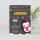 Convite de aniversário para Pinguin Convite de Feriado para Pinguim Convite para primeiro aniversario Winter onederland. Vire-se para uma diversão com este convite para o tema do Pinguim de inverno com um belo Penguin e alguns flocos de neve por aí. Basta editar este modelo fácil de usar no menu Personalização para torná-lo especial.