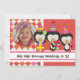 Pinguins adoráveis com balões, presentes e chapéus de festa em um convite colorido de vermelho, laranja, rosa quente e branco com áreas que você pode personalizar com a foto do seu filho e as festas de aniversário específicas dos convites de aniversário para tema de pinguim que ela certamente ama!
