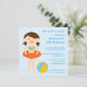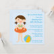 Este convite para festas de aniversario de meninas 5.25x5.25 tem um tema de piscina bonito. Há uma menina parada com um tubo de natação ao redor da cintura ao lado de uma bola de praia. Você pode personalizar facilmente as informações da sua parte à direita. Trabalho de arte criado por Babystar Design