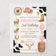 Convite de aniversário para Rodeo Cowgirl. Levante-se e comemore em estilo com este editado Convite de Aniversário da Garota Rodeo! Apresentando um tema divertido no ocidente com impressão de vaca, sotaques cor-de-rosa, botas de vaqueiro e gráficos — é perfeito para o dia especial da vovó. Personalize facilmente os detalhes usando o modelo editável. Ideal para festas de aniversário de rodeio, ocidentais ou nacionais!