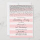 Convite de aniversário com falso brilho prateado e listras cor-de-água rosa fundo.
