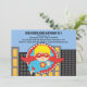 Comece a comemorar com este convite SUPER. Excelente para aquele Super Herói na sua vida! É um convite adorável com um fundo azul claro. Há prédios de cidades amarelas e negras com um super-herói giro saindo de um círculo irregular. Ele tem cabelos loiros e está vestindo cores vermelhas e azuis, veja os muitos outros produtos e designs nesta linha. ©JW Ilustrations