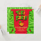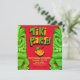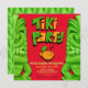 Convite de aniversário surpresa do Partido Tiki em verde-claro e amarelo com fundo vermelho.